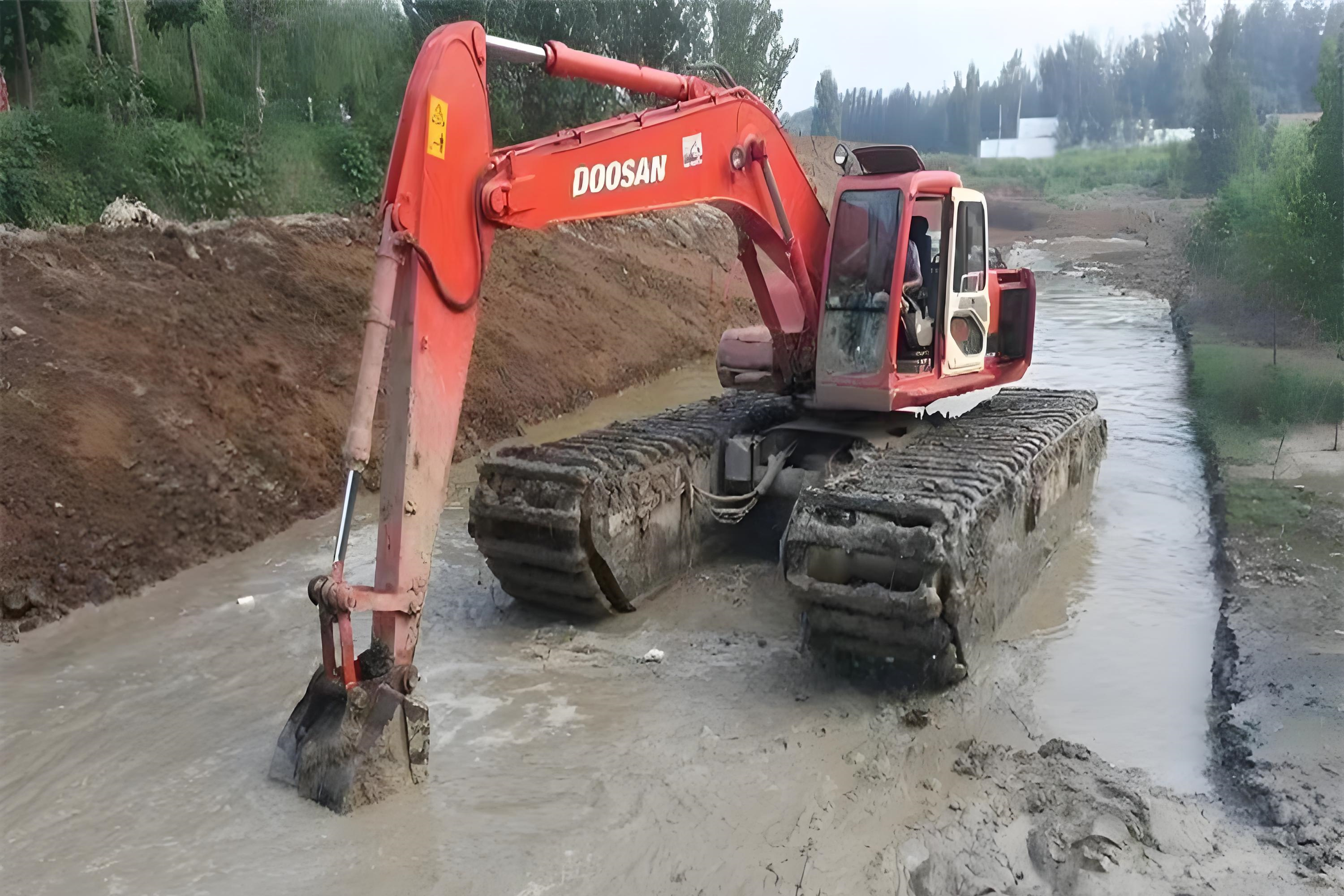 一是給挖機加裝 “穩(wěn)船系統(tǒng)”。在浮箱兩側安裝可伸縮的鋼樁,作業(yè)時把鋼樁深深扎進河底,像 “船拋錨” 一樣固定機身,哪怕水流速度到 2.5 米 / 秒,挖機也能穩(wěn)如磐石。